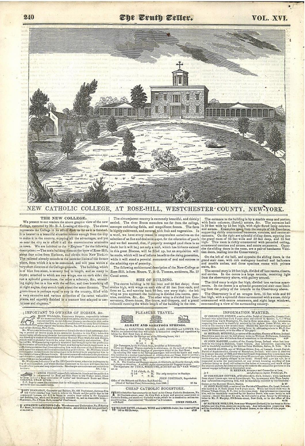 “It is located in a beautiful situation remote enough from the city to make it in the country,” the accompanying text in The Truth Teller, an early Catholic newspaper of New York, explained, “enjoying all the advantages, and yet so near the city as to afford it all the conveniences attainable in town.”