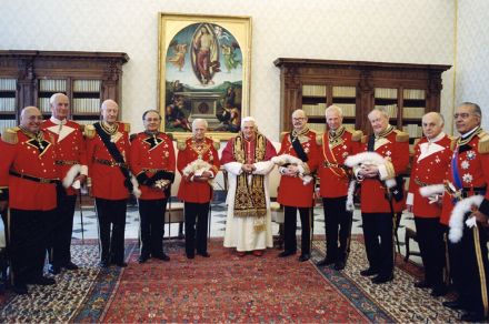By special request, I bring you photos of the recent audience of His Holiness Benedict XVI, Bishop of Rome, Vicar of Jesus Christ, Successor of the Prince of the Apostles, Supreme Pontiff of the Universal Church, Patriarch of the West, Primate of Italy, Archbishop and Metropolitan of the Roman Province, Sovereign of the State of the Vatican City, Servant of the Servants of God (to use his full title) with His Most Eminent Highness, Fra’ Andrew Willoughby Ninian Bertie, Prince and Grand Master of the Sovereign Military and Hospitaller Order of St. John of Jerusalem, of Rhodes, and of Malta, Most Humble Guardian of the Poor of Jesus Christ (likewise, to use his full title) along with the Sovereign Council of the said order. According to ecclesiastical protocol the Grand Master, though merely a vowed religious, is accorded a dignity equal to that of a cardinal. His Holiness received the Grand Master and Sovereign Council on June 24, 2005, the Feast of St. John the Baptist, who is the patron saint of the Order. The Grand Master was also greeted on April 24 of this year, when the photograph below was taken.