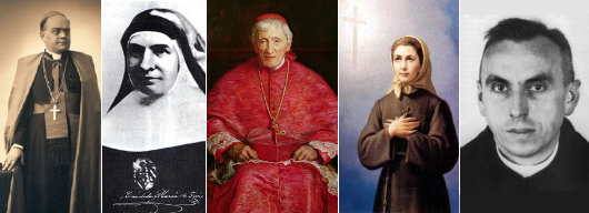 Decrees recently promulgated in the Vatican move sixteen candidates for sainthood forward in their cause. The most famous of the twelve is the English cardinal & convert from Anglicanism, John Henry Newman (above, center). A miracle attributed to the intercession of Cardinal Newman has been accepted by the Congregation for the Causes of the Saints. The Congregation has also accepted individual miracles attributed to the intercession of: Blessed Cándida Maria de Jesús Cipitria y Barriola (above, second from left; 1845-1912), the Spanish founder of the Congregation of the Daughters of Jesus; the Servant of God Angelo Paoli (below, second from right; 1642-1720), an Italian Carmelite priest; the Servant of God Maria Alfonsina Danil Ghattas (1843-1927), a cofounder of the Congregation of the Sisters of the Most Holy Rosary of Jerusalem.