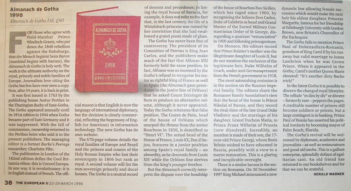 Whilst rummaging through my room at home in New York last week, I came across this article which I had cut out of the ill-fated European in 1998 written by none other than Mr. Gerald Warner, KM. I was fourteen years old in 1998 and the European folded about a year later. Click here to read in jpg form. (A large file, some browsers may require resizing to view the text at a readable size).