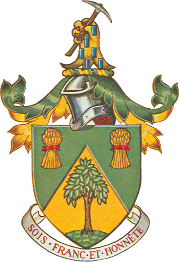 Our friend Mr. Bruce Patterson, who is St-Laurent Herald up in the Canadian Heraldic Authority, was kind enough to send along this rendering of the arms of the Hon. Paul Comtois from Beddoe’s Canadian Heraldry. As Bruce points out, the garbs probably refer to Comtois’s agricultural background, and the miner’s pick in the crest alludes to his ministerial portfolio. The motto is “Be frank & honest”.