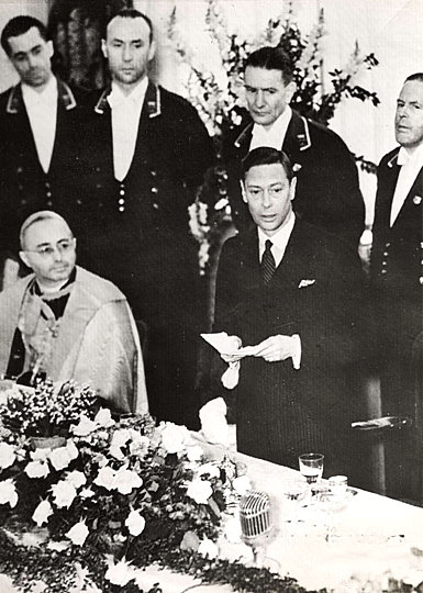 In the above picture, the King and Queen of Canada hear a loyal address in the Salle du Conseil législatif of the Hôtel du Parlement in the city of Quebec. Below, the King speaks at a state dinner in the Chateau Frontenac. Seated is Cardinal Villeneuve, the Primat du Canada and Archbishop of Quebec.
