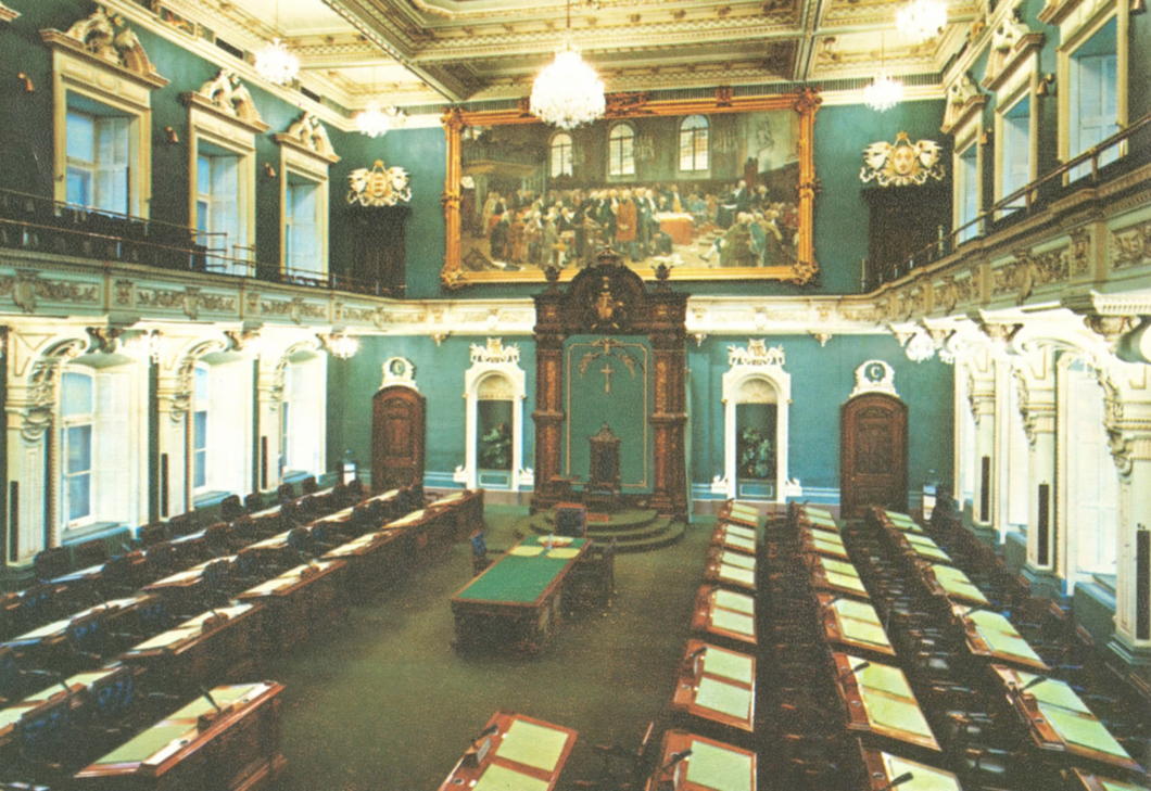 Officially the plenary chamber of Quebec’s unicameral parliament is boringly the salle de l’Assemblée nationale but because of the colour of its walls it is more often known as the Salon bleu. One’s never surprised when Quebec bucks a trend or (more specifically) rejects an Anglo convention but it turns out the province’s plenary chamber did in fact used to be green until relatively recently.