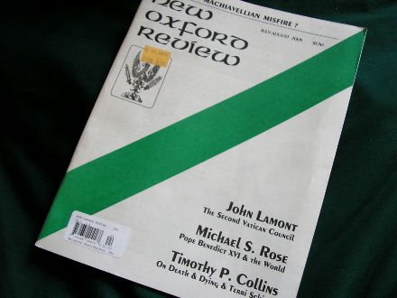 Whilst jolloping through the Hudson News shop in Grand Central, in the vain hope of being able to flip through a grievously overpriced imported latest edition of Country Life, I stumbled upon the latest issue of the New Oxford Review, the cover of which claimed that an article by John Lamont lay within. Delving into the formerly Anglican now ardent traditionalist Catholic publication I found that indeed it is the John Lamont we know and love. (He is also known as ‘Big John’ owing to his heighth and to differentiate him from the comparitively ‘Little Jon’ Burke).