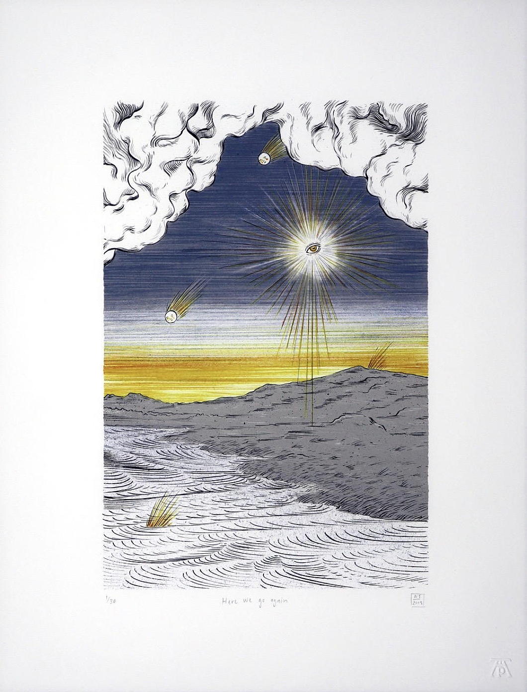 ■ We leave you with this six-colour lithograph from the Pretoria-based artist Nina Torr entitled ‘Here we go again’ (an edition of thirty, available from the Artists’ Press):