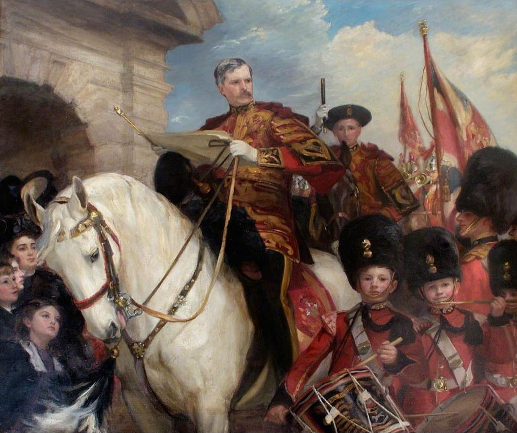 A triumphant painting, but a last hurrah. The central figure is Sir Nevile Wilkinson, the last ever Ulster King of Arms & Principal Herald of Ireland, exercising the duties of his office by proclaiming the accession of the new king at Dublin Castle.