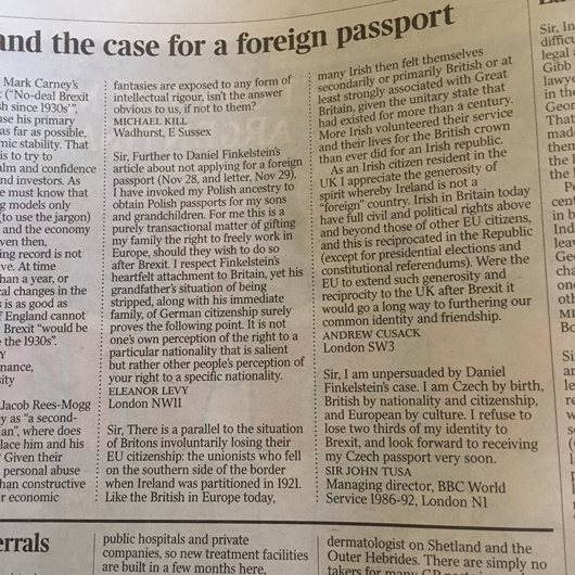 Sir, There is a parallel to the situation of Britons involuntarily losing their EU citizenship: the unionists who fell on the southern side of the border when Ireland was partitioned in 1921. Like the British in Europe today, many Irish then felt themselves secondarily or primarily British or at least strongly associated with Great Britain, given the unitary state which had existed for more than a century. More Irish volunteered their service and their lives for the British crown than ever did for an Irish republic.