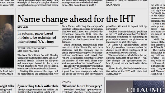 The New York Times Company, owners of the Paris-based International Herald-Tribune, announced recently that they are going to kill off the 126-year-old newspaper. I had predicted back in 2009 that this was precisely what would happen because of the aimless direction the IHT had taken since the New York Times became the sole owners of the title in 2002, after a long period of joint ownership with the Washington Post. The IHT will be merged into the worldwide operations of the Times this autumn and be rebranded as the International New York Times