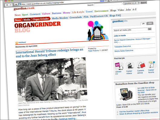 Writing about the latest changes over at the International Herald Tribune, the Guardian‘s media blog “Organgrinder” linked to our “remarkably comprehensive” post covering the subject in depth. I’m slightly embarrassed to say I’ve never seen any of Jean-Luc Godard’s films, something I will have to rectify through the DVD collection at the French Institute’s Haskell Library when I’m back in New York.