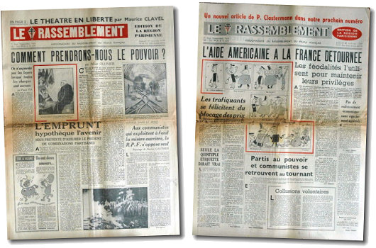 These two numbers of the Gaullist newspaper Le Rassemblement show what even a little dose of colour can do for a journal printed in black-and-white. The lack of additional colour was due to economical, not to mention technological, restraints, but we have now gotten well used to our newspapers being printed in a full array of colour. Yes, even the FAZ.