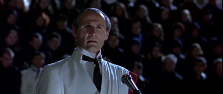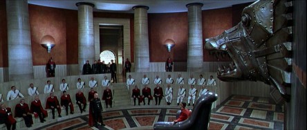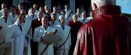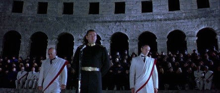 JULIE TAYMOR’S VERSION of Shakespeare’s “Titus Andronicus”, the 1999 film “Titus” (with Anthony Hopkins in the title role), is a rather interesting modern interpretation. It has rather whimsical aspects, such as the ‘SPQR News’ microphone the characters are seen speaking into. The rivals for the imperial throne bedeck their supporters in the colors of Rome’s rival football teams: the red and yellow of Roma for Saturninus and the pale blue and white of Lazio for Bassianus. I especially enjoy the Senators bedecked in old-school white suits making them appear like a convivium of Kentucky colonels. Worth seeing.