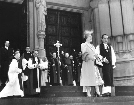 In 1954 Queen Elizabeth, the Queen Mother (n.1900, m.2002) visited New York to accept an educational fund raised by Americans in memory of the late King George VI. On the evening of November 1 of that year, the Seventh Regiment entertained Her Majesty with a special ball held in her honor at the Armory on Park Avenue (view above). Her Majesty also visited the Cathedral of St. John the Divine where she was received by the (Episcopal) Bishop of New York, the Dean, and the clergy of the Cathedral. The three stone blocks on the façade seen in the view below have since been sculpted.